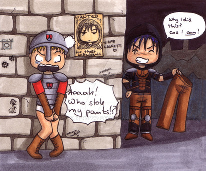 In one of my Lucienpictures a peron said that is sad that you never see Lucien doing his job in the game Oblivion. That's true. I'd really like to see how he handles his job.The sketch for this one was done in University some weeks ago, but I drew both as normal people, not as chibis. But when I saw some Lucien chibis here on dA, I wanted to draw one, too. ^^ So here is it: LuLa doing his job! In chibiform!