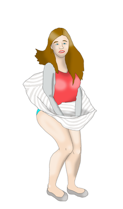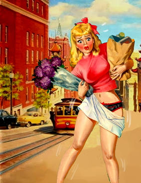 After spending a little over two weeks painting a haunted house, I wanted to do something completely different.I believe this is the first time I've depicted a woman in colored panties. I usually go for white or off-white, but thanks to being reminded of something I saw on Candid Camera in the '70s, I decided it was high time I revisited one of my first fetishes.