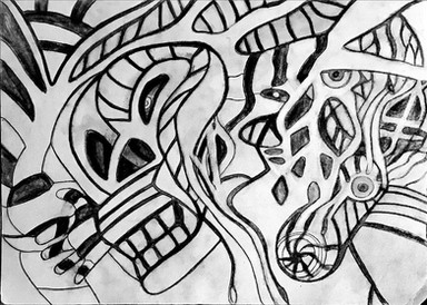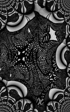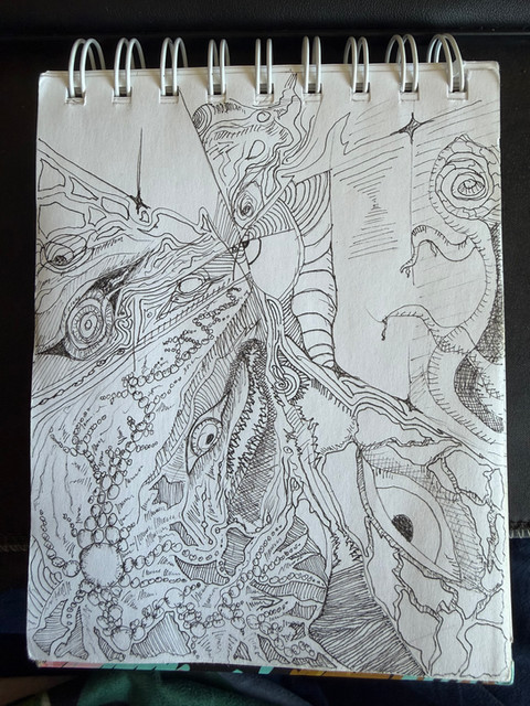 Light editing done to bring contrast up, due to taking picture in poor-light environment.Sometimes just zoning out with a pen and paper can produce results, with enough time. Got this done in three 6-hour periods of continuously drawing on a 6" X 9" paper.