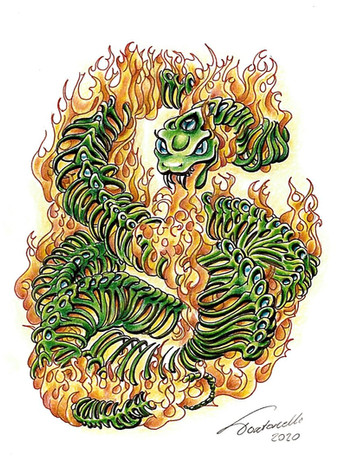 This illustration was inspired by the snake-lizard-bug fossil representing three trophic levels found in the Messel Pit, known for highly preserved fossil specimens. Read the full journal, Fossil snake preserving three trophic levels and evidence for an ontogenetic dietary shift , or read the synopsis at National Geographic .