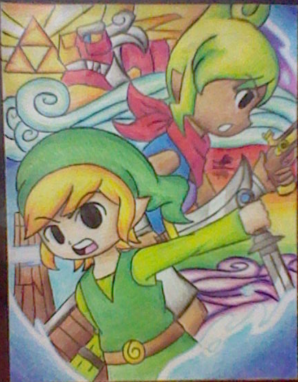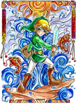 It features a deku leave, a toon link with a wind waker in hand, a harvest moon chicken (at his feet), a mew, and a super mario sunshine sun (top right)