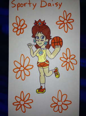 If I had to choose my favorite female video game character, it'd have to be Daisy from the Super Mario series, hands down. (Although Peach is in a close second.) Why? I dunno.I drew her in her sports wear, spinning an egg (or a volleyball if thats easier to grasp) on top of her right index finger. Apparently, I made her left handed with that glove she's wearing, but if it counts for anything, Miyamoto was left handed himself.