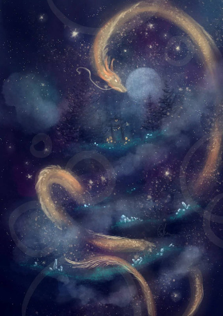 #dragon #flower #girl #sky #stars #tree