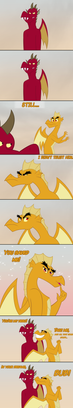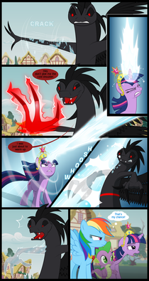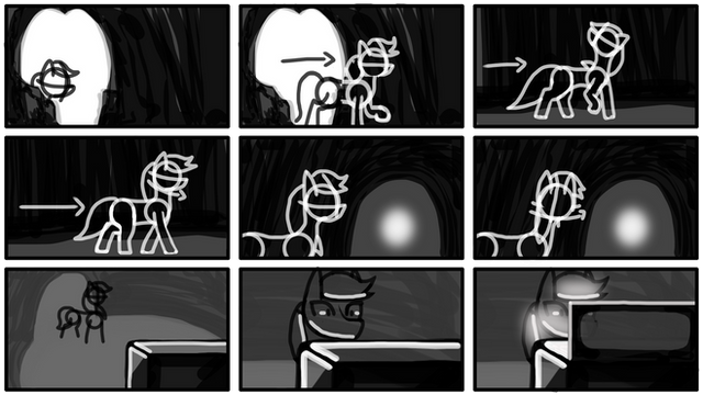 Ponies are easy to draw, because you can find examples for their poses and expressions, and they don't have fingers/claws. Plague's hands can actually be tricky to draw, and here in this panel I had to figure and test some things out first.
