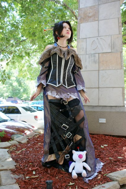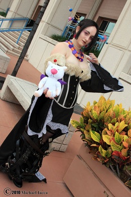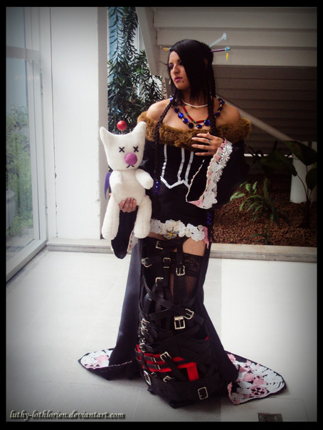 Myself as Lulu from Final Fantasy X. Photo taken by Ollie [Orobouros.net] at Anime Next 2008. Here's the stereotypical "boob pose." Enjoy. XP I've had a lot of people inquire about the wig for this costume, and so I'd like to take this opportunity to explain: It is actually constructed from a shoulder-length black wig, which was styled extensively, pulled back, and stubbed. Afterward I braided several packs of matching extensions and attached the braid-bun and longer braids separately. I made this styling decision based upon some prior experience [several years ago, one of my best friends cosplayed Lulu and had a nightmare of a time trying to style a waist-length wig into Lulu's extremely detailed coif], and I have to recommend the method for any future Lulu cosplayers! It definitely beats having to mess with those silly Godiva and Enchantment wigs. :3 As I have mentioned in previous uploads of this cosplay, please ignore the belts, as they were a rush job and not nearly as detailed as I would one day like for them to be. ^__^; Also a slight disclaimer that my costume is based primarily off of Nomura's concept art, and so there are a few slight deviations from the version of Lulu you may be familiar with from the game [brown fur, additional earrings, etc].Please no critiques/criticism. I'd like to keep this gallery happy! :3