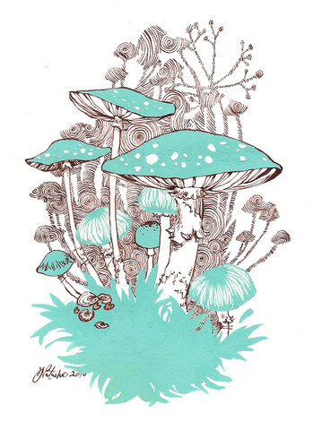Ink, liquid acrylic, acrylic paint and watercolour.