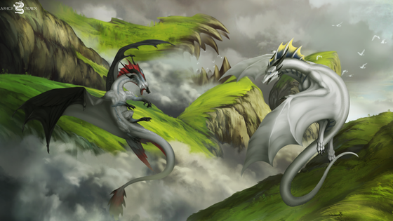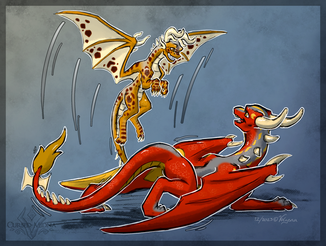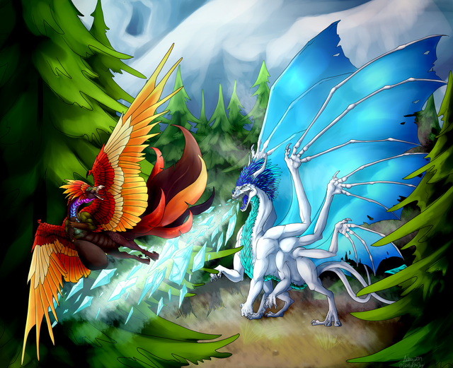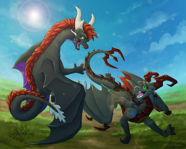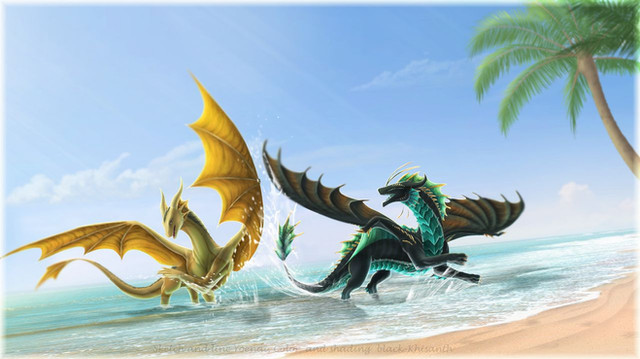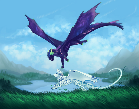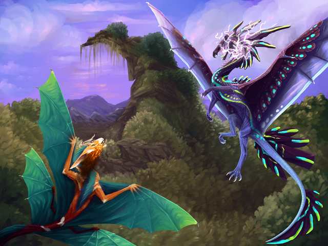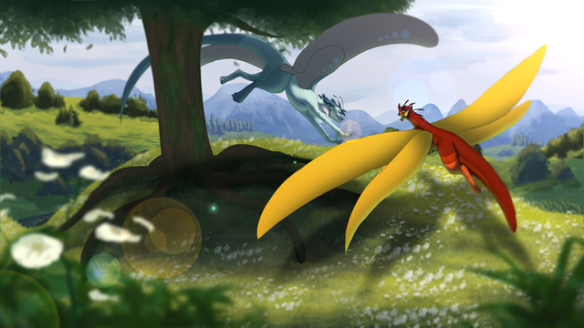 "Like a shadow the electric drake mimics the wind dragon's movement, copying her as they fly around the tree, tilting their bodies ever so slightly to perform a wide turn around the tree. the sun's rays reflecting off of the dragon's scales."