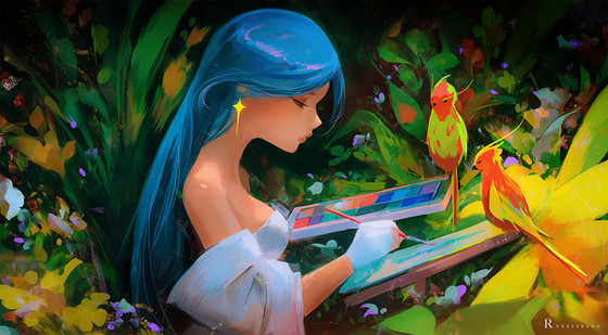 What a gorgeous painting! The light filtering through those leaves and highlighting the girl, all the different shapes of the plants, the macaw, the girl's dress - everything is so beautiful!!!