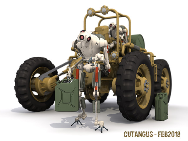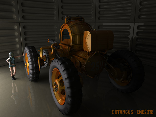 This is a four-wheel vehicle for planetary exploration, human size but piloted by an automated servant.Tyres are composed by several independent metal sheet resilient to sand erosion.