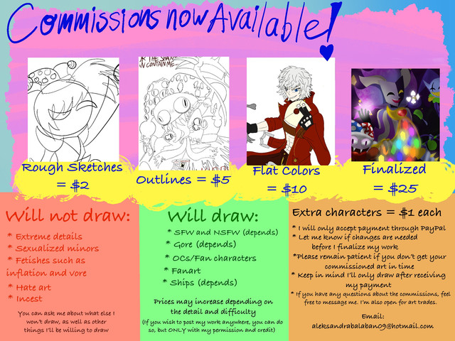 I would rather not go into another long sob story as to why money is so hard to come by right now, but I will say in the past six months my family members and I have been placed on various needed medications that are extreamly expensive, leaving us with little to no money to pay for food and other bills. So even though my online commissions have never worked before, I decided to try and help out if I could, so If anyone was hoping to commission me someday, NOW'S THE TIME!!For the commissions themselves, I will draw basically everything EXCEPT for: