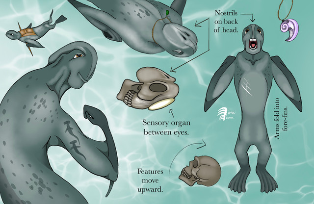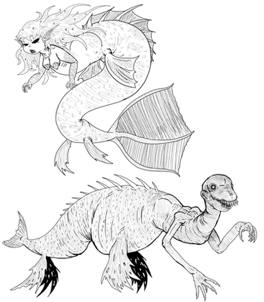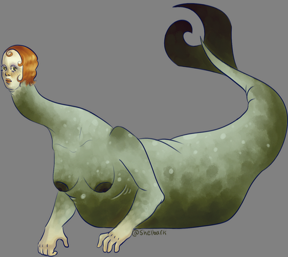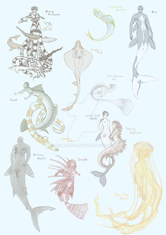 These have taken up the appearance of various sea elements and creatures: catfish, eel, barnacle, coral, narwal, seaweeds, jellyfish, and other creatures they've encountered along the coastline travelled. They are only a limited trio of examples added onto the template pictured on the right. Pluff hags can literally take up the appearance of any sea element, up to and including taking on the head shape of, say, a hammerhead shark combined with the fins of a manta ray. No two ever look the same, though the face is always at least vaguely humanoid upon a few hundred years' development. The ones pictured can be aged at somewhere from 1,000 to 1,300 years old and are nearing their final mermaid-like phase of life when they are in their most deceptive, cunning and deadly state.What is a Pluff Hag?