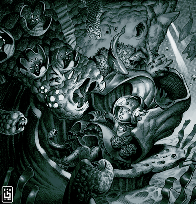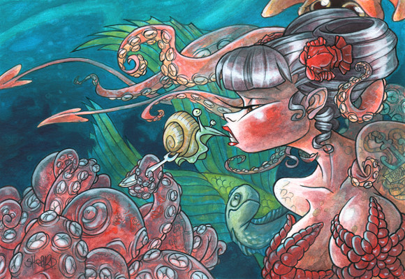 It flares its tentacles and head fins out and does the cuttlepluff's signature "tusking" display of aggression. The pluff hag may seem surprised, but this could just be her usual intense gaze. Normally a cuttlepluff will flee or try to blend into its surroundings when a hag is sighted, but this one is caught off guard and instinctively moves to guard its precious collection.I'm finally done noodling this 5x7 bit of paper. Taking the time until I really felt satisfied feels so good, but I must say shading that anemone was absolute torture in monotony. lolΒ The point of this was to show interaction with a new hag design using a pose of a cluttlepluff flaring. I plan on doing more of these interaction pieces with pluff hags versus cuttlepluffs, since where you see cuttlepluffs, the hags are never far behind, and their design potential is really out there.
