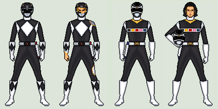 Mighty Morphin Power Rangers 2nd Black Ranger: Adam Park1ST ROW: Civilian, Morphed without helmet, Morphed with Dragon Shield without helmet, Mastodon Ranger movie version without helmet, Frog Ranger movie version without helmet, Black Ninjetti Ranger without mask, Black Thunder Ranger without helmet, Black Lion Ranger, Black Dino Ranger without helmet
