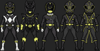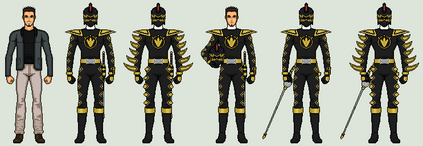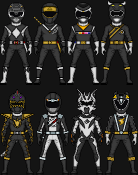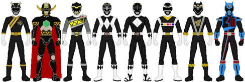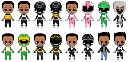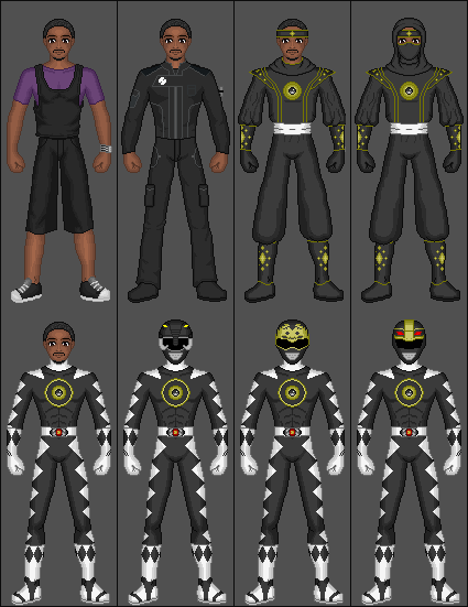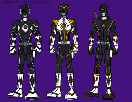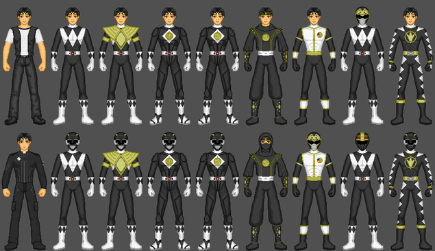 Mighty Morphin Power Rangers 1st Black Ranger: Zack Taylor1ST ROW: Civilian, Morphed without helmet, Morphed with Dragon Shield without helmet, Mastodon Ranger movie version without helmet, Frog Ranger movie version without helmet, Black Ninjetti Ranger without mask, Black Thunder Ranger without helmet, Black Lion Ranger, Black Dino Ranger without helmet