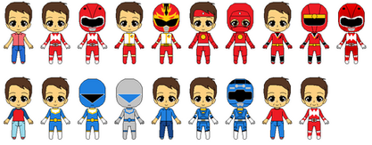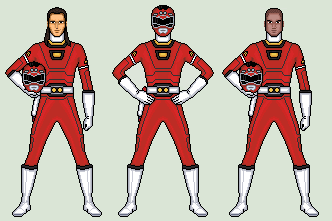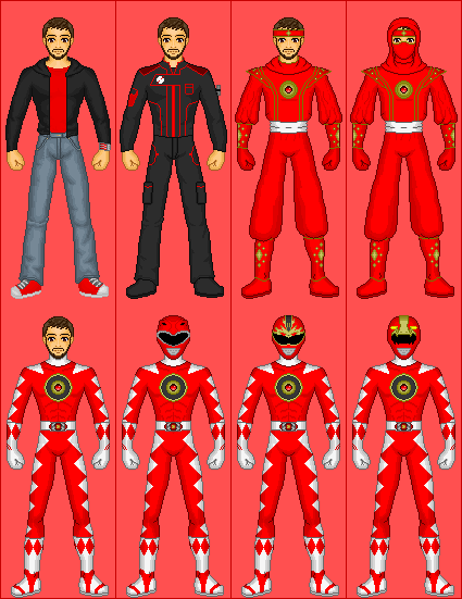 Mighty Morphin Power Rangers 1st Red Ranger: Jason Lee Scott1ST ROW: Civilian, Morphed without helmet, Morphed with Dragon Shield without helmet, Tyrannosaurus Ranger movie version without helmet, Ape Ranger movie version without helmet, Red Ninjetti Ranger without mask, Red Thunder Ranger without helmet, Red Dragon Ranger, Red Dino Ranger without helmet