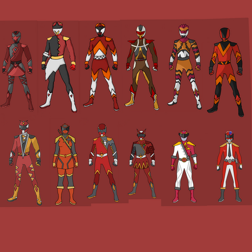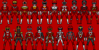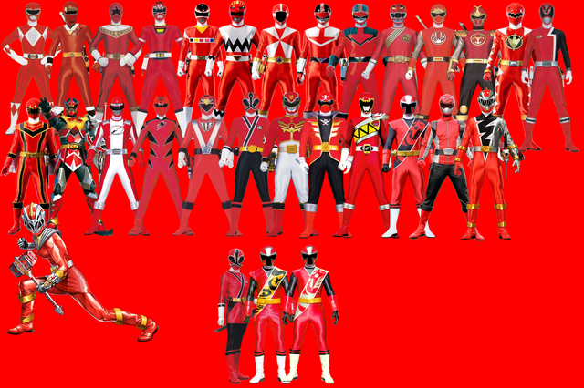 2ND ROW: Operation Overdrive Uniform, Morphed, Morphed with Dragon Shield, Tyrannosaurus Ranger movie version, Ape Ranger movie version, Red Ninjetti Ranger, Red Thunder Ranger, Red Dragon Ranger, Red Dino Ranger