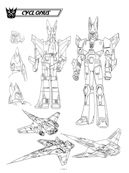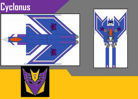 The basic concept for this redesign was actually completed back in 1995. The tubes on the head is to give a similar look on a fighter pilot's oxygen mask (a design element that is on all the Decepticon jets). I also gave Cyclonus a bit of a knight look in the over all visual to make him seem somewhat "heroic".This design did make it into my Decepticon Group Shot: [link]