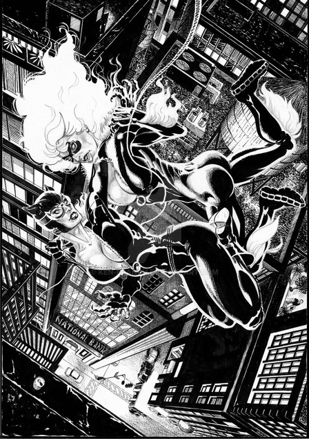 Man, simply amazing detailwork on this Their outfits just look perfectly leathery with all the wrinkles and seams. For some reason I find your take on Black Cat's footwear to be rather cool, though I don't remember her ever wearing big star earrings on the job...