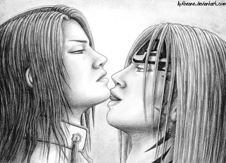 ... i like the art... but i just didn't know that it ACTUALLY happened in the series! did it? really? i wouldn't mind if it was a fan based paring of characters but the fact that it actually happened in the series is absolutely WRONG! but the art is absolutely wonderful! i luv the choice in colors^^