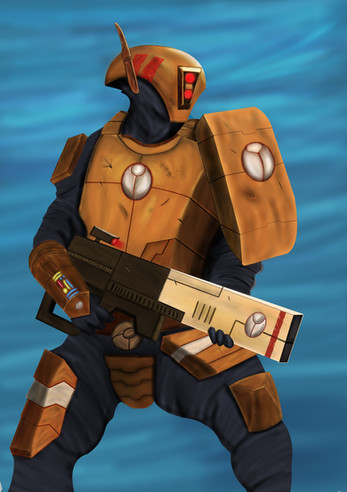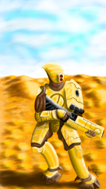 I love the shading on his yellow armour, and the picture is perfect comic book style. Great work. One thing I would do is take the blur/smear tool to some of the skin shading. It's a little uneven.