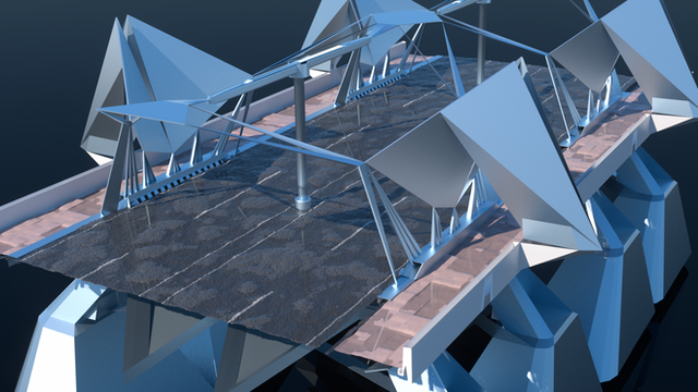the organic structure is indeed exquisite, as is the choice of lighting. the only thing that really bothers me are the overly pointy bits on "landscape" just left of the bridge on the bottom bank. possibly rounding them off a little would give a smooth, organic feel to the ground as well...