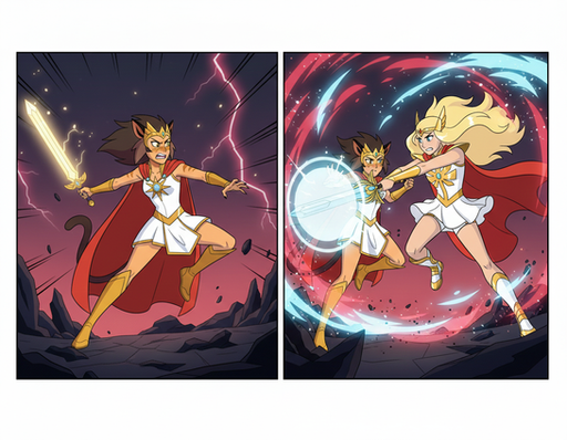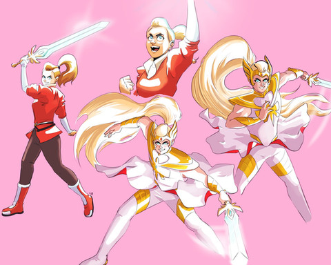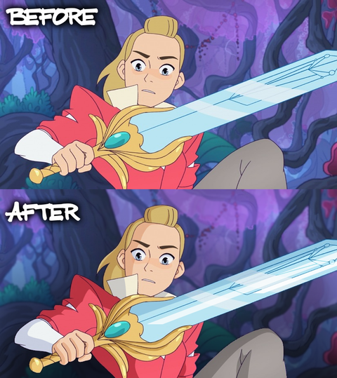 Since the original released image felt off, I applied a few touches that followed the rule of thirds and Pop to her outfit in an attempt to see if her outfit was unbalanced, and lacking central points that drew the eye. All without adding anything that did not already exist in the She-Ra universe, old and new.Got to say, giving her back her original sword removed all the problems it had with it blending into her outfit and becoming lost in the image.