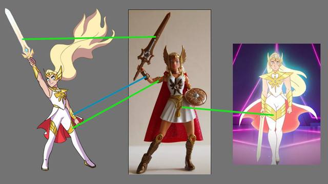 I wanted to do more, but I gave myself an hour to apply changes. I focused on the question, if I had a 3x3 camera grid, what would I change to create a more visually interesting image? The version you see is the result as her costume's points of interest now sit along lines camera operators compose shots on. If this was a full image Long Shot of She-Ra, I imagine her outfit would be rebalanced again, but as she is seen in this Medium Long Shot, her original costume felt to bundled up at the top and needed to be lowered so She-Ra's costume points of interest were not top heavy