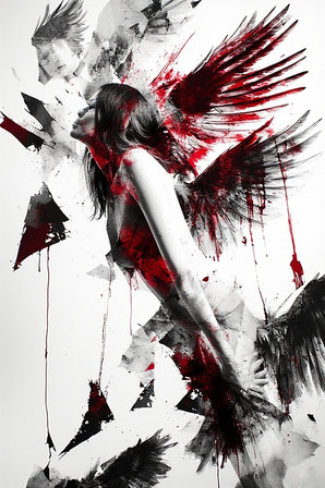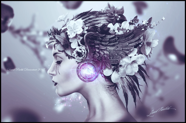 I like the idea, the execution is good, but there are a few details, suggestions. First, the glow in the middle. I would remove it, it does not benefit the image, and here is why. When you look at this image, what is the point of interest? In my opinion, the point of interestΒ is her face, because it has good expression, and because the pose suggests it, everything about this pose is up, up, up. And when you find the point of interest, it has to be dominant thing on the image, and everything else is there to complete the story. Here, you have very well positioned feathers, that are leading toward the face, closing the lower part of the image and opening the upper part, that is great. Then you have the wings, that are a bit too light and should be darkened, but they are completing the pose and the story, ad that is good. And the background gives that explosive feeling, with the lightened part in the middle and that dark purple splash in the bottom.