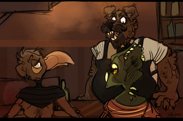 Smith has a chat with the barkeep Sweet Moreef- Kind of a challenge to draw!