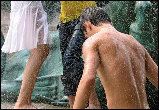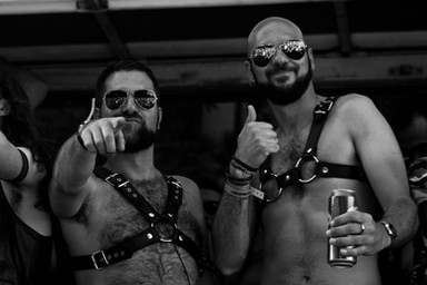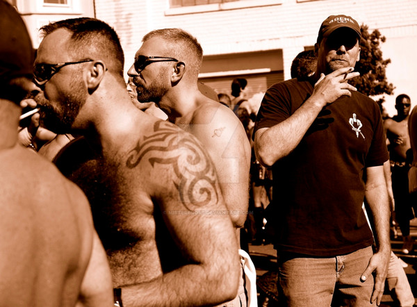 C'est l'idée que cela donne, mais la vérité est tout autre. La scène se passe au centre de la place de la Bastille, toutes ces personnes sont passées au dessus d'une haute grille que tu aperçois dans le fond à droite de l'image. C'est à la fin de la Parade et les mecs ont marché, dansé depuis plusieurs heures sous le soleil. A l'arrivée Place de la Bastille, il y a toujours un concert Techno. Le son et le tempo sont tellement fort qu'il est quasiment impossible de s'entendre parler. Ces mecs sont dans un espace clos et interdit, symbolique, il y a des photographes et des gens qui les regardent de l'extérieur de cette grille tout autour...ils sont donc en train de parader, de danser, de se reposer un instant avant d'aller danser. Les deux mecs baraqués discutaient à la cool en faisant de grands gestes. Moi j'aime bien le mec dans le fond à droite avec un chapeau haut de forme ! mais tu as raison il y a une certaine tension dans cette photo !