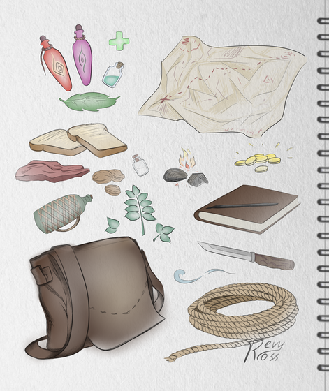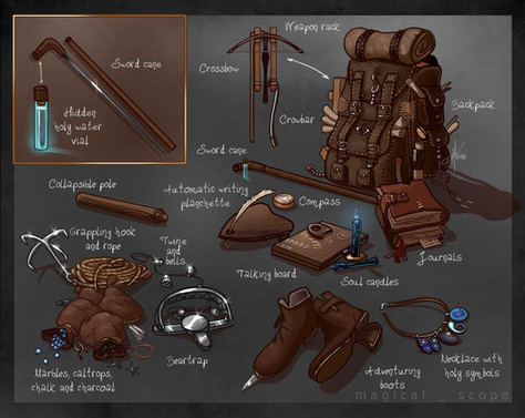 3: A ridiculous amount of scrolls, both empty, and filled with maps and drawings. (These are the only items kept in the scroll case, everything else is in the pack.)