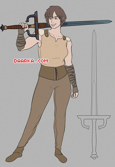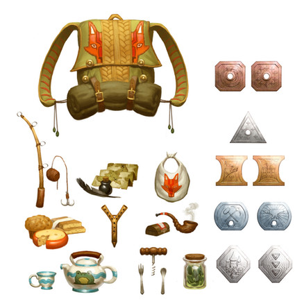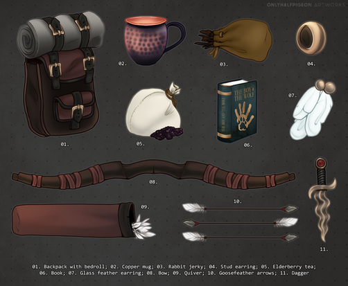 This is Daarka's entire life packed into a bag and a scroll case. Every piece is precious to her and she isn't very fond of anyone else going through her belongings. I've been meaning to draw this all out for a while now, but having someone writing with me (and having their characters potentially rummaging through her shit) got me to actually get it done1: A self-made lantern. Disassembles for easy storage. Consists of two clamshell-like halves--one with a peg in the center (for a candle to sit on), and the other with a highly polished, mirror-like interior that reflects the candle's light like a beam, as well as a peg used to fit the side's hinges together. The bottom plate has a ring-like handle. (She carries a couple home-made candles with this contraption, as well.)