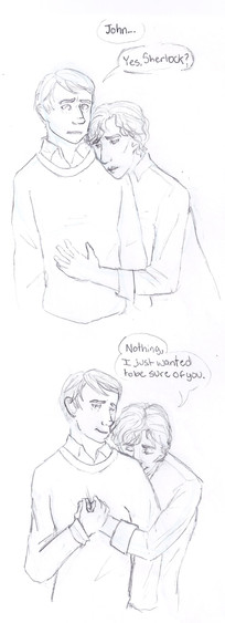 I love this! Johnlock for life! I love how Sherlock has John listen to his chest, could you do a drawing based off of a fanfic? Basically Sherlock gets over stimulated & John comforts him by having Sherlock listen to his heart.