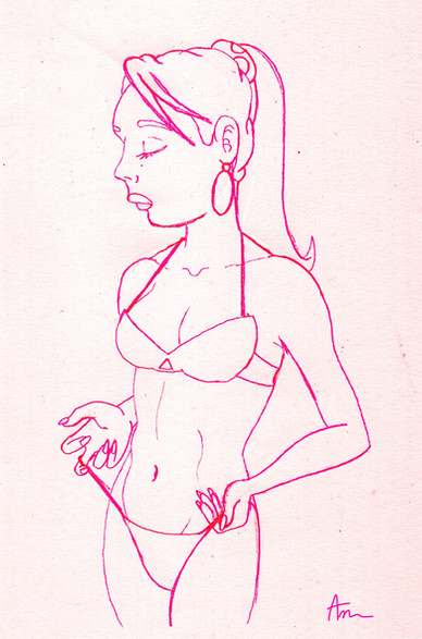 I appreciate the realism and shading of the piece, because watercolour isn't known for its ability to render shading and highlights, and I love your description of your anal-retentive approach, but that's not what I like about this picture. No, I like the tiny little curve just above the waist that almost looks like a ripple of fat, a tiny fold of skin. That's what made this picture for me. I bow to your ability not to idealize and smooth her out like a magazine model. Real women ripple.