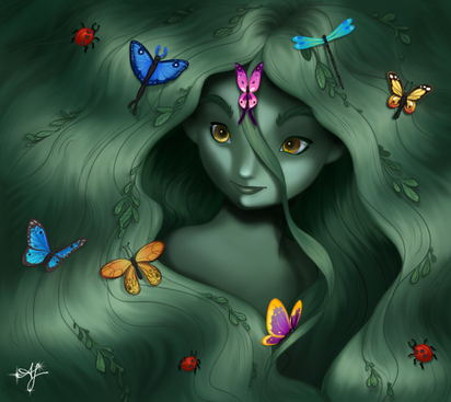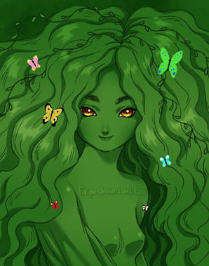 there is a crazy vid story on youtube were she is a hidden daughter of hades and eris, they wanted a weapon but because hades lord of the dead mojo got reversed by eris's chaotic nature instead of death incarnate they got a mini Gaia who they banish even though she's barley a day old and who does she meet? hexxus spirit of destruction and because she so innocent she's not that scared of him but her parents rejection didn't do her any favors and hexxus who likes her well enough and even makes her laugh but her connection to chaos brings out he's more violent side so he often goes from serenading her with"toxic love"to "I'LL BURN YOU ALL!!!"