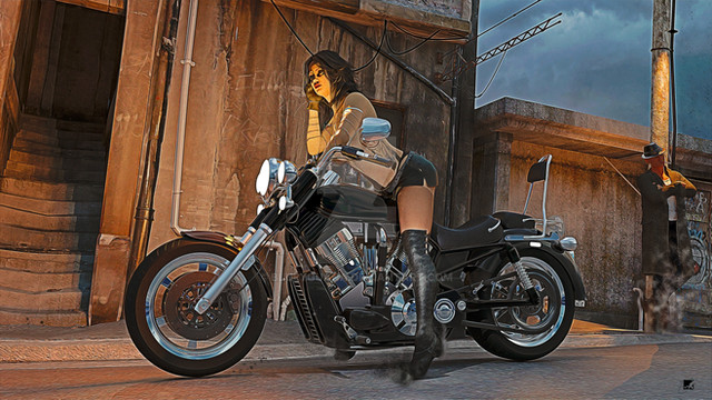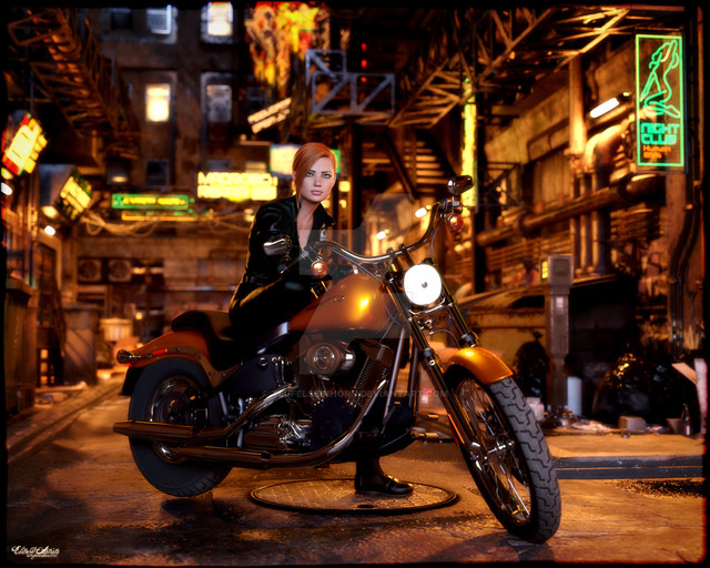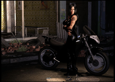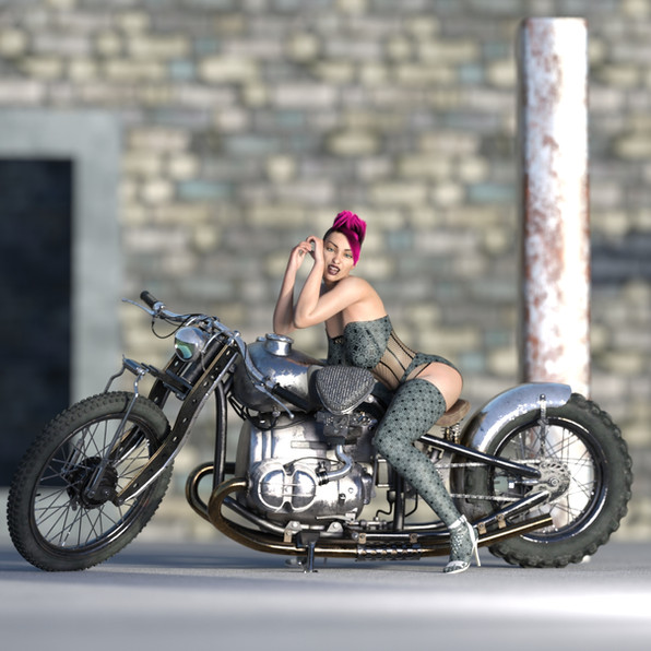 This one was done based on a request made by 'Terminator9632587411'. So here you go my friend. Here is the lovely Jasmijn by 'USB' at RenderHub. The bike comes to me via 'mbit', also from RenderHub, who gifted it to me. It was a freebie he picked up and shaded. If anyone knows the creator of the base bike drop me a line. I would like to credit that person as well.