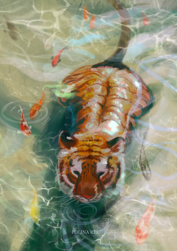 This is really beautiful! I love the expression on the tiger, it almost looks like it's falling through a sky/sea full of fish with the way the facial fur is sticking up.