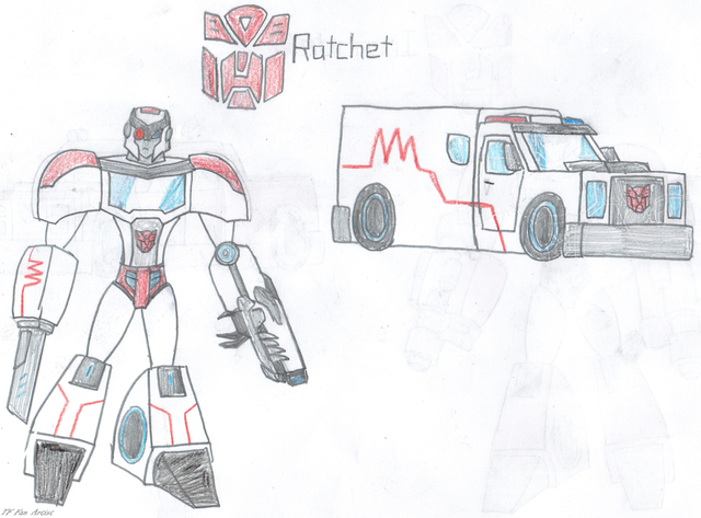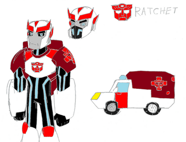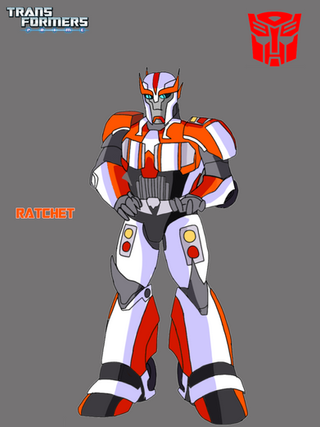 Ratchet is the Autobots' medical officer. As a war veteran, Ratchet has fought many Decepticons, and is also Optimus Prime's best friend. Although he's cranky at times, Ratchet believes conflicts can be solved peacefully without violence, though he will carry out Optimus' plans if he has to. Ratchet has also saved many Autobot lives, capable of repairing the greatest of wounds, though he is still working on Bumblebee's damaged voice.