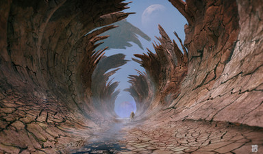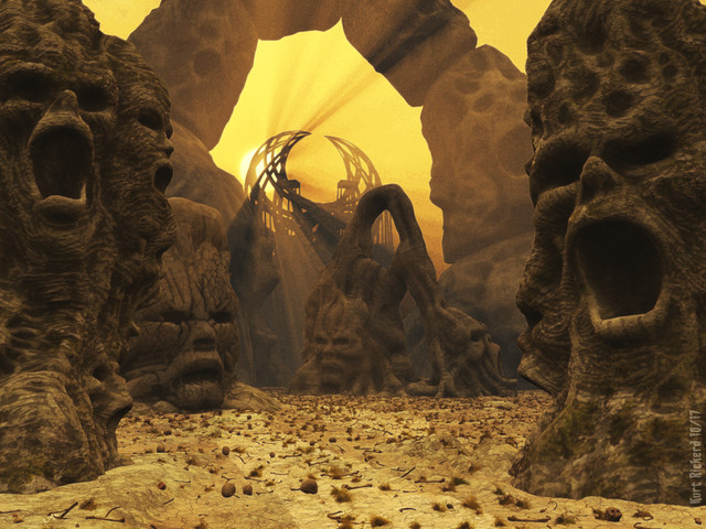 I felt like doing another landscape scene and I came up with this sunny but eerie desert path through towering and weathered structures.All except the background mountains is rendered in Mandelbulb3D (HeightMapIFS and amazingIFS). I grabbed the background from cgtextures.com