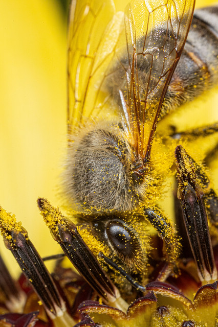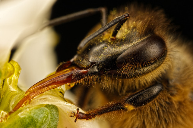 I baited this honeybee to get her to slow down and let me get close. Shot at almost 3x with a Canon MPE-65mm macro lens.This image was chosen by National Geographic for their Daily Dozen in the 4th week of August 2009.
