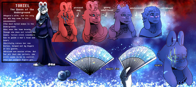 One thing that she lacks in stark comparison to her husband is the smile that Asgore bears, no matter the day or weather. She is a quiet woman, who hides behind her triumphs like a wall, and deflects my words -regardless of complementary nature- with effortless elegance. I have never seen her laugh since the day that I betrayed them all, even when I lifted the fog from her mind. I worry for her, sometimes, but I catch myself. That is Asgore's job.