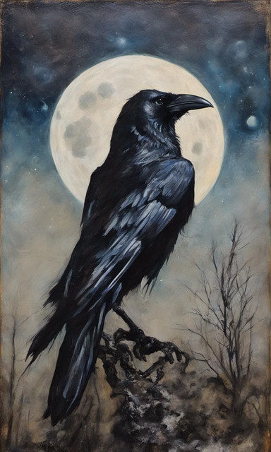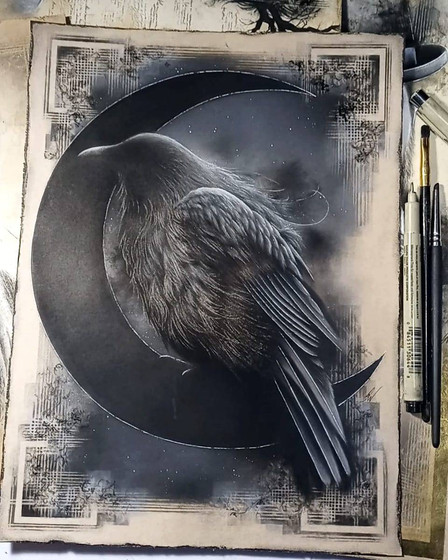 Yay! It's been a while since you posted new works. I love the details of the feathers on the raven. The glare on the canvas kinda makes it look like a starry sky. I hope your tattoo art endeavor is still going well.