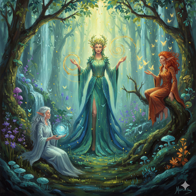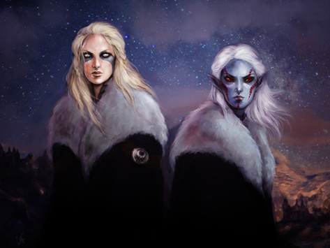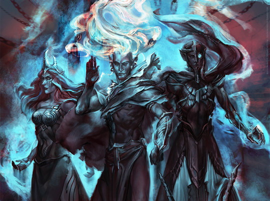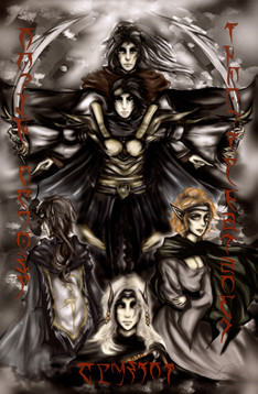 I have no idea of who these people are but I really like the imagery, dramatic, mystical. The details on the bow and armour are excellent and the woman's expression of grim determination very good. The shadows of birds, or birdlike shadows, blends nicely with the background and the woman who seem to watch over the other two.