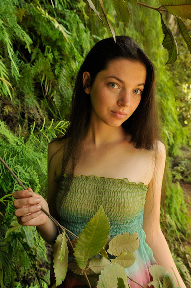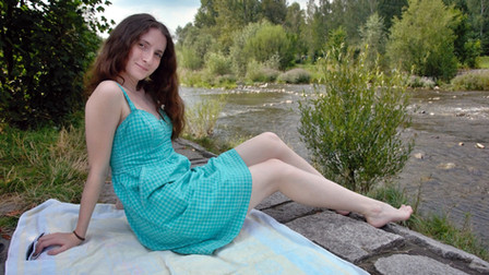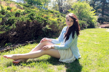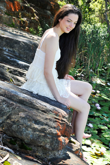 Beautiful smile and you have beautiful long hair. The dress is cute, and nice feet.