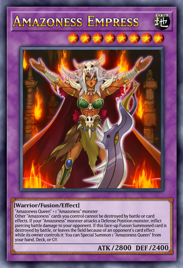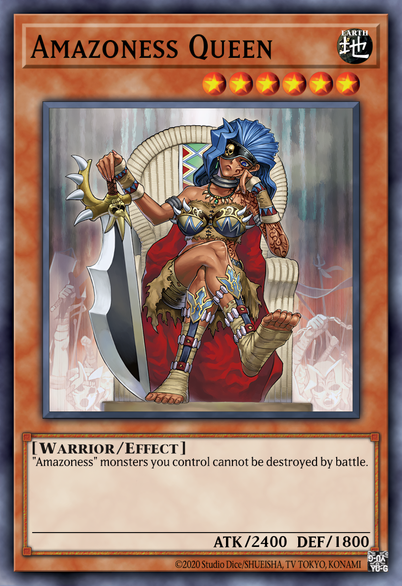 If you control no monsters, or an "Amazoness" monster, you can Special Summon this card (from your hand). This card's name becomes "Amazoness Queen" while it is on the field or in the Graveyard. Once per turn, when this card destroys an opponent's monster by battle: You can Set 1 "Amazoness" Spell/Trap Card or "Queen's Pawn" directly from your Deck, and if it it meets its activation conditions, you can immediately activate it.