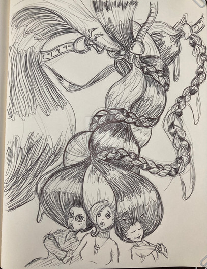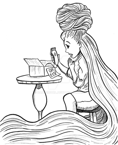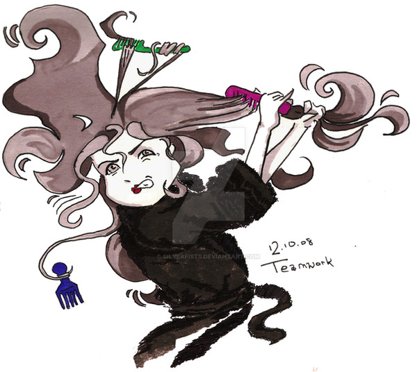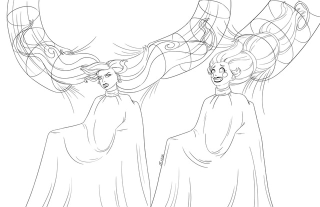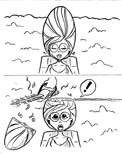 My half of an art trade with cendande12 !Camilla insisted on wearing an elegant beehive hairdo to the opera, to the chagrin of the patrons directly behind her. One of them, Sterling, took matters into his own hands, and pulled out a load-bearing bobby pin. Camilla's hair tumbled around her in a jumbly mess. Her evening was ruined, but at least now everyone could enjoy the opera!