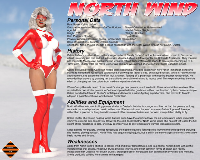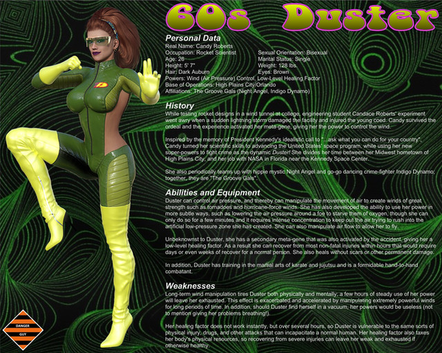 I was looking at my original character profile for Duster recently and I realized it needed updating. I needed to add information about her low-level healing factor as well as a "weaknesses" section, among other things.
