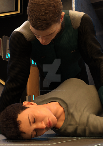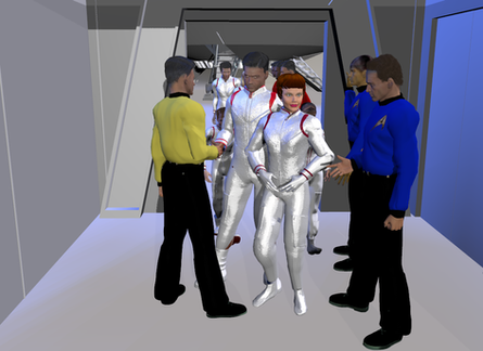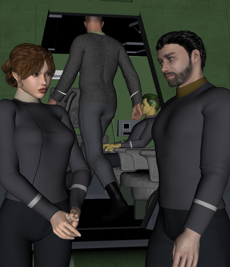 A commission from , featuring Captain Candace Roberts of the U.S.S. Curie in a spot of trouble. Should have realized the red shirt was an imposter when he survived the away mission!Related content