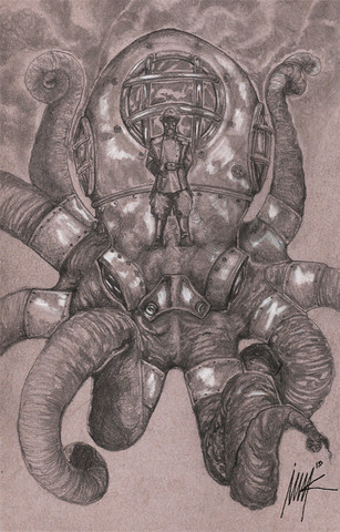 Excellent use of color contrast, this piece reminds me of the perils of Jules Verne's '20,000 Leagues Under the Sea.' The hapless diver doesn't realize he's about to become lunch.
