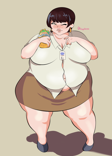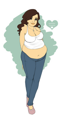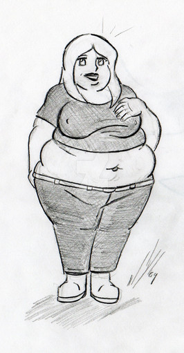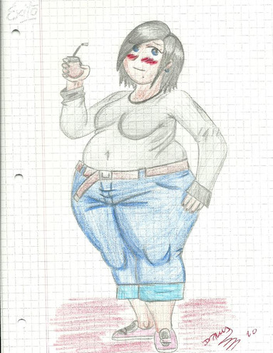 Well, as some of you may already know, it's lover's day around here... since I knew i'd be overwhelmed with my final tests by now, I've kept this one waiting to be posted since april or so... anyway, it's here now...!in this picture I've drawn my lover, my feedee, my little polar bear, as I like to call her... we've met on feabie last year, and my life has been a lot better ever since... this is my version of one of my favourite pictures of her... she's already outgrown and popped that poor shirt open, by the way...